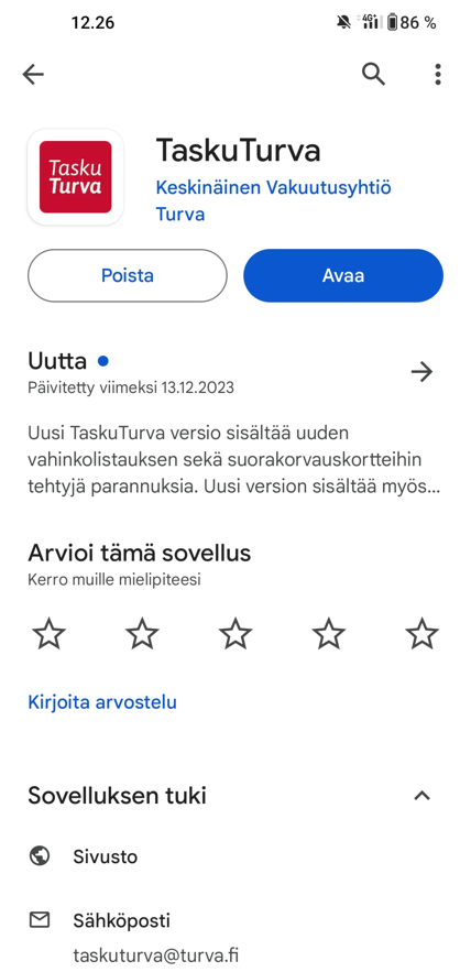 TaskuTurva-sovelluksesta on ilmestynyt uusi versio. Huomasimme, että Android-puhelimen käyttäjillä sovelluksen uusi versio ei päivity oikein. Jotta saat TaskuTurvan uudet ominaisuudet käyttöösi, poista ensin TaskuTurva puhelimestasi ja lataa sovellus uudelleen Play-kaupasta. Pahoittelemme aiheutunutta vaivaa!